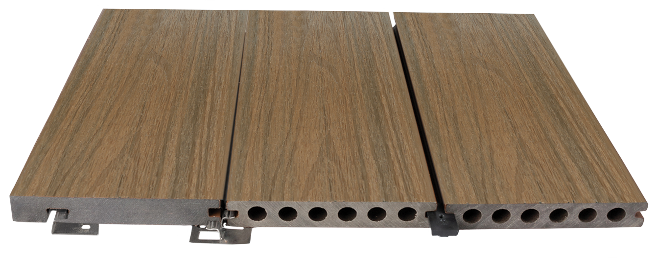 These naturally enhanced woodgrain boards are double-sided and boast dual colouring with a hollow core – allowing the boards to be laid at (maximum) 400mm centres.